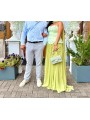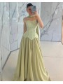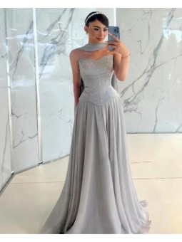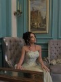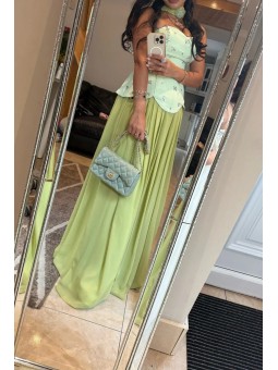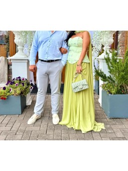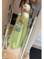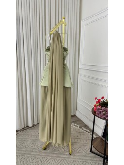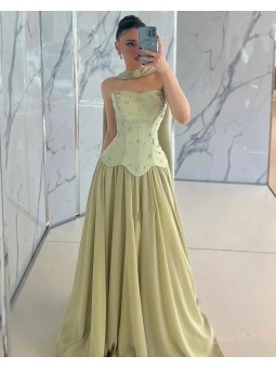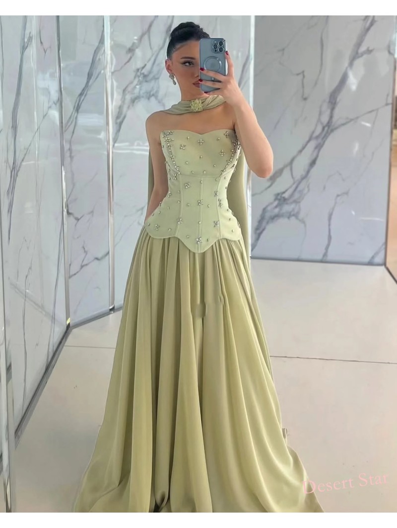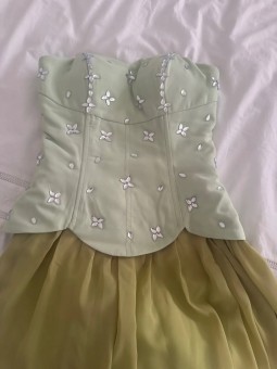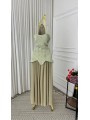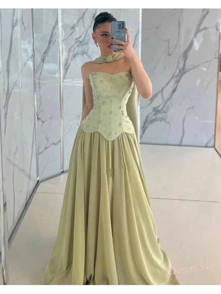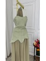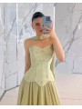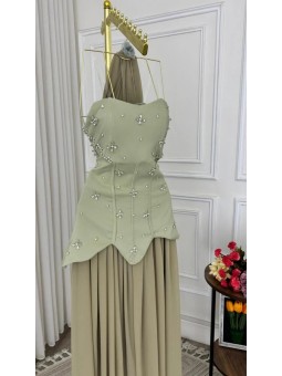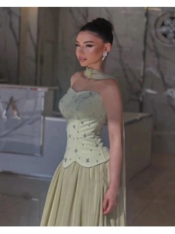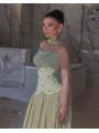 Luxusní společenské šaty s korzetovým živůtkem se srdcovým výstřihem a odnímatelným šálem. Top zdobený kamínky. Na šněrovačku. Materiál šatů je splývavý šifón. Barva v konfekčních velikostech je zelená (do olivova). Při šití na míru lze model poupravit a ušít v jiné barvě, pro změny nás nejdříve kontaktujte.