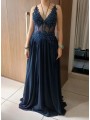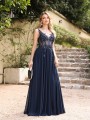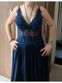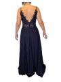Elegantní dlouhé společenské šaty, které zaujmou svou kombinací jemného tylu, krajkových aplikací a romantického střihu. Živůtek je zdobený bohatou krajkou s jemnými flitry, která působí luxusně a zvýrazní ženskou siluetu. Průhledné detaily na živůtku dodávají modelu moderní a smyslný vzhled.