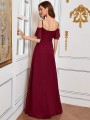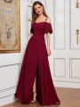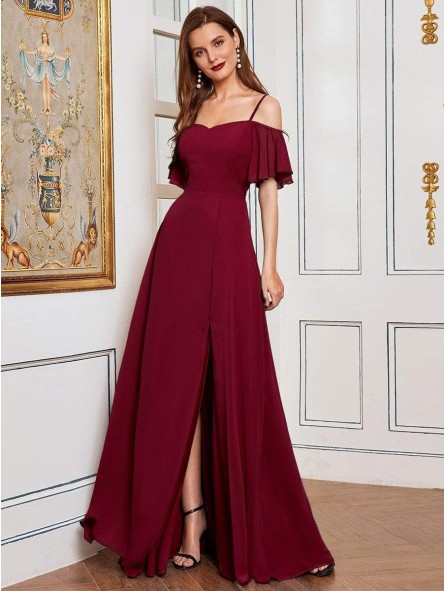 Romantické šaty se spadlými volánkovými rameny a špagetovými ramínky. Šaty jsou s rozparkem