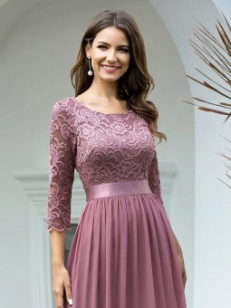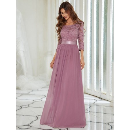 Krajkové společenské šaty v délce až po zem jsou jedinečně doplněny širokým páskem lichotícím postavě, který zvýrazňuje linii pasu. Záda střižená ve tvaru V.