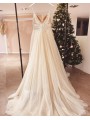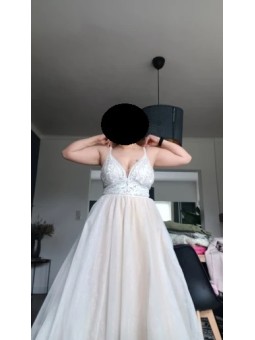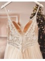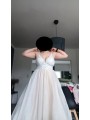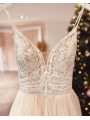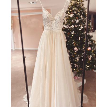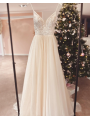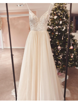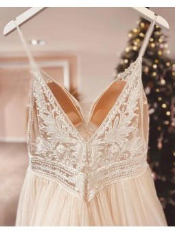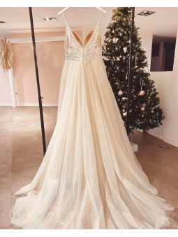 Tylové svatební šaty s V výstřihem, zdobeným krajkovým topem na špagetová ramínka.