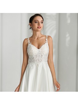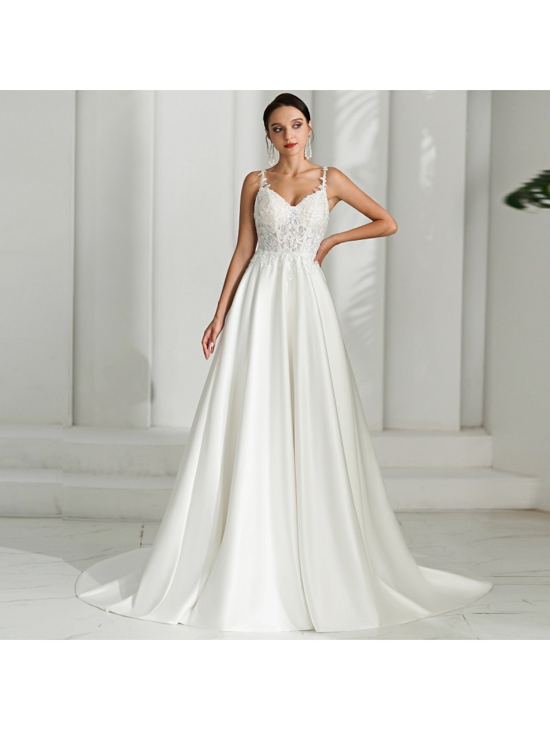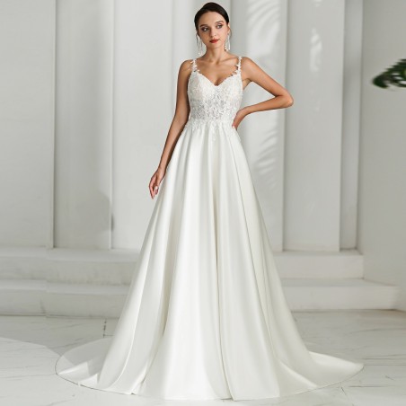 Svatební saténové šaty s krajkou v barvě ivory s V výstřihem. Možné šití na míru za příplatek +1000,- Kč (doba doručení kolem 6-8 týdnů při šití na míru) . Pro volbu šití na míru zvolte velikost NA MÍRU a přidejte Vaše míry dle instrukcí ODKAZ ZDE Při objednání na míru akceptujeme pouze platby předem (převodem/ GoPay).