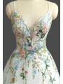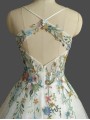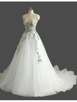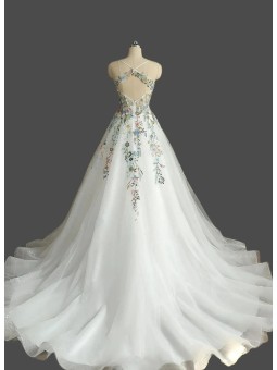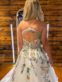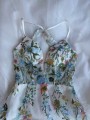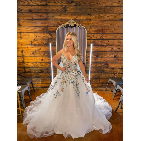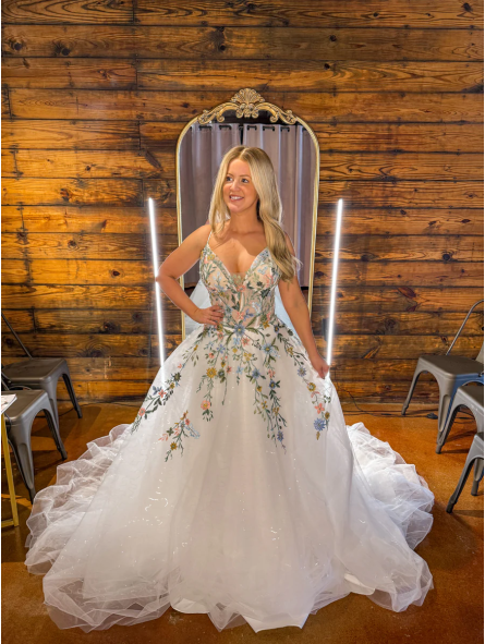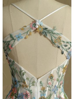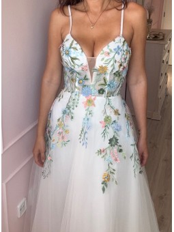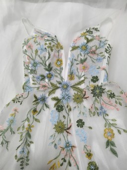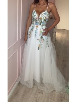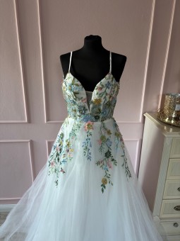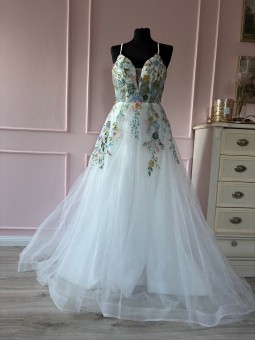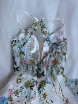Šaty jsou zdobené bohatou barevnou květinovou výšivkou, která přechází z živůtku do sukně a vytváří dojem rozkvetlé louky. Zadní část s odhalenými zády a ozdobným páskem působí moderně a elegantně.