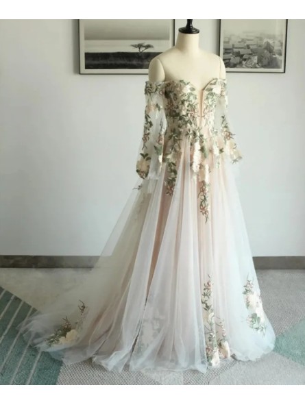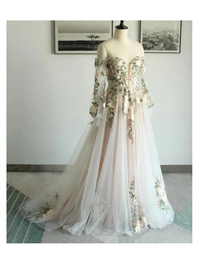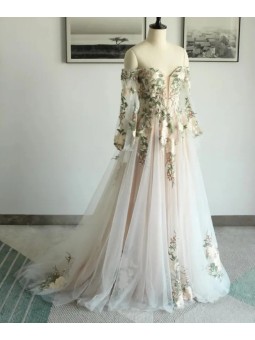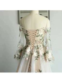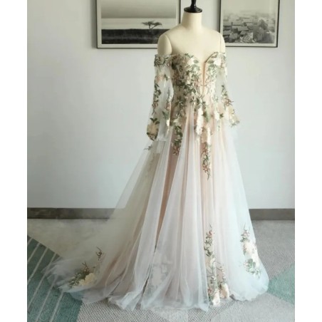 Střih s odhalenými rameny a dlouhými rukávy dodává šatům pohádkový nádech. Šněrování na zádech umožňuje perfektní přizpůsobení postavě a zajišťuje maximální komfort při nošení.