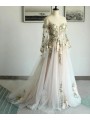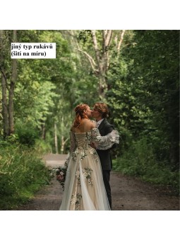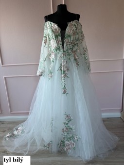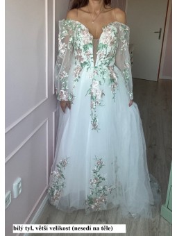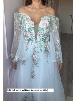 Rukávy: dlouhé, z průhledného tylu s výšivkou