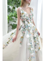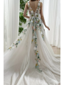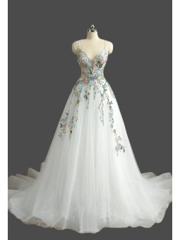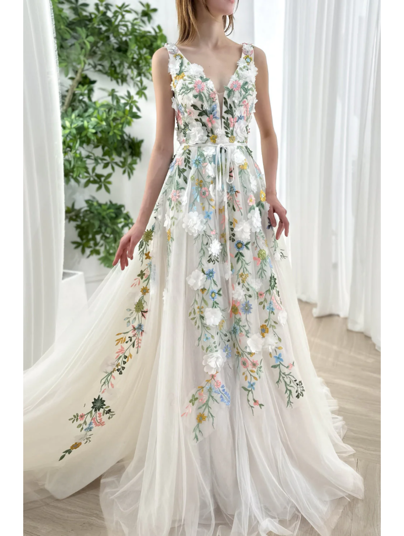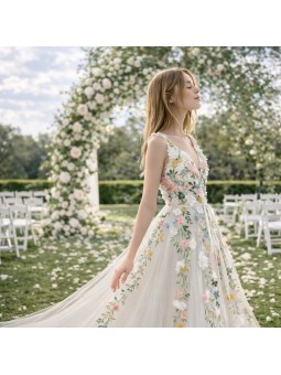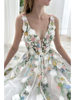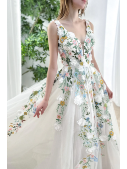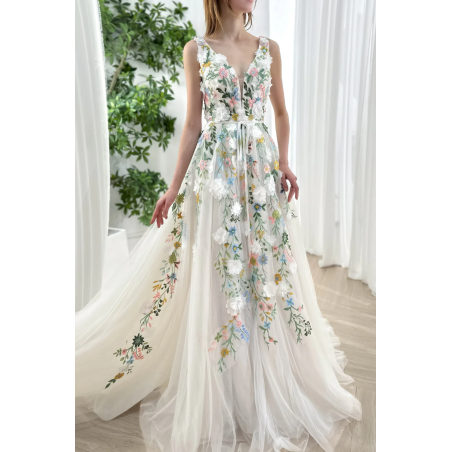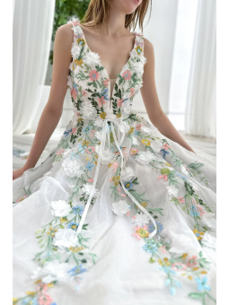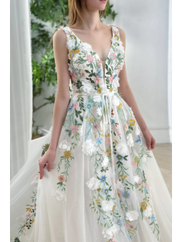 Éterické svatební šaty v odstínu ivory zdobené jemnou barevnou květinovou výšivkou, která vytváří dojem rozkvetlé louky. Lehká tylová sukně se vzdušně pohybuje při každém kroku a dodává šatům pohádkový nádech.