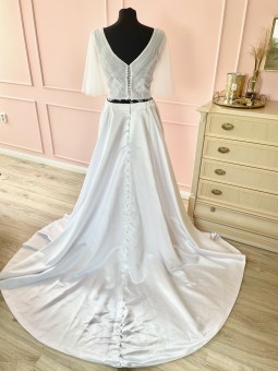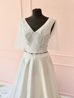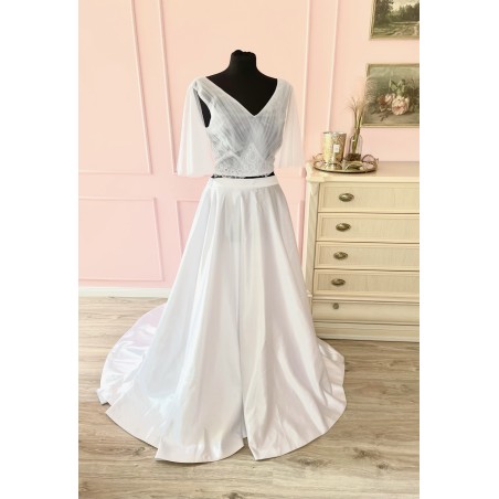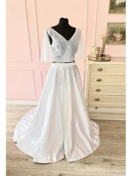 Šaty se skládají ze 2 kusů - saténová sukně se zvýšeným pasem a s tylovým topem zdobeným krajkou.