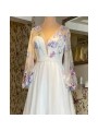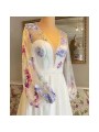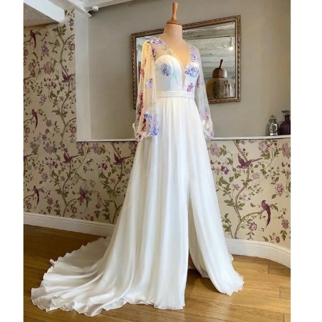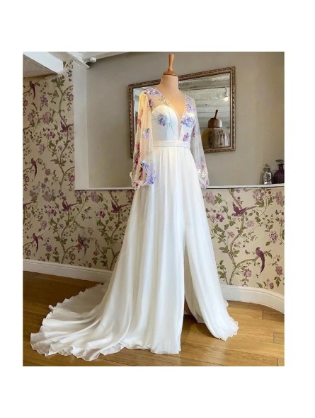 Šifónové šaty s květinovou krajkou a dlouhými rukávy. Sukně má rozparek.