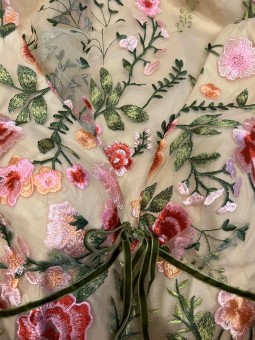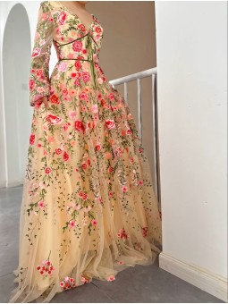 Květinové tylové šaty v šampaň barvě na zip. Možné šití na míru za příplatek +500,- Kč (doba doručení kolem 6-8 týdnů při šití na míru) . Pro volbu šití na míru zvolte velikost NA MÍRU a přidejte Vaše míry dle instrukcí ODKAZ ZDE  Při objednání na míru akceptujeme pouze platby předem (převodem/ GoPay).