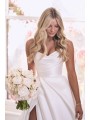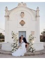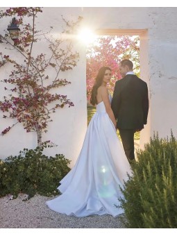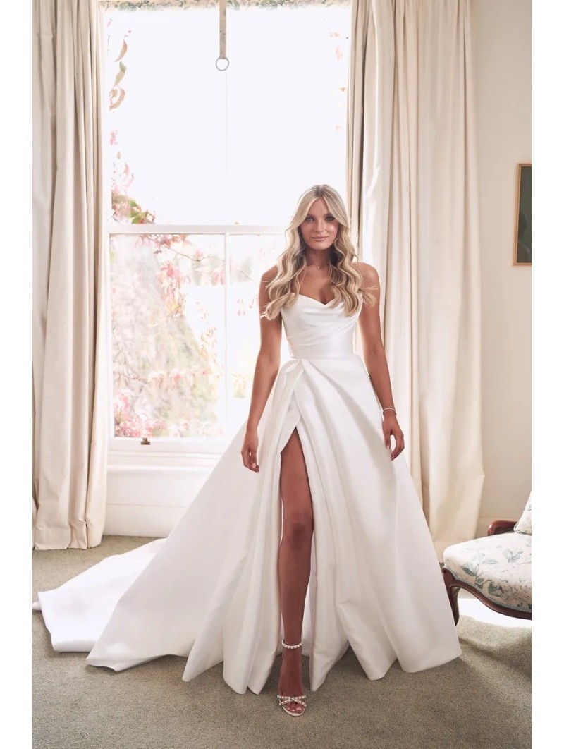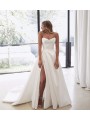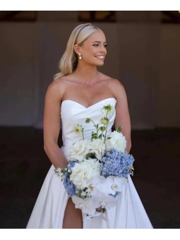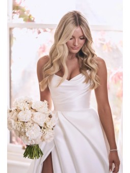 Tyto nádherné svatební šaty z hladkého saténu spojují nadčasovou eleganci s moderním stylem. Hladký korzetový střih krásně zvýrazní postavu a přirozeně formuje ženské křivky. Dominantou šatů je smyslný vysoký rozparek, který dodává celému modelu lehkost, mladistvost a okouzlující žensky působící siluetu.