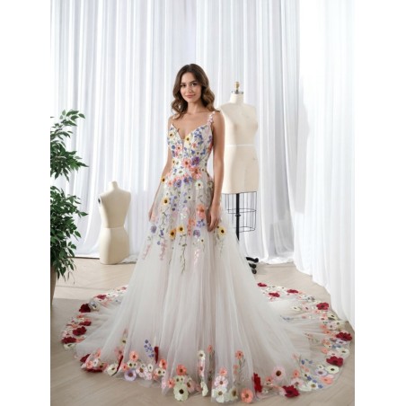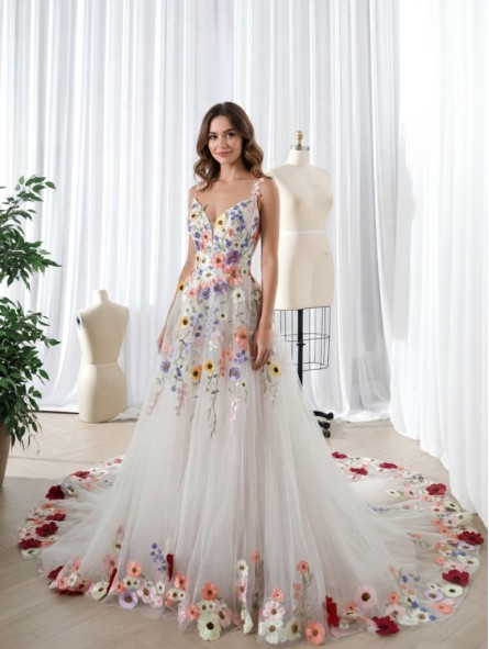 Romantické květinové šaty z jemného tylu, které působí lehce, svěže a velmi žensky. Živůtek je bohatě zdobený barevnou květinovou výšivkou, která plynule přechází do vzdušné sukně s jemným rozptylem květů a výrazně zdobeným lemem. Úzká ramínka a tvarovaný korzet zvýrazňují dekolt i pas, zatímco šněrování na zádech umožňuje perfektní přizpůsobení postavě.