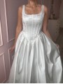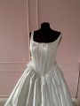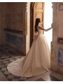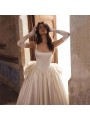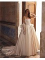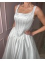 Tyto okouzlující svatební šaty přinášejí dokonalou kombinaci nadčasové elegance a pohádkového vzhledu. Hladký korzetový živůtek s jemným zdobením z umělých perel podtrhuje ženské linie a vytváří nádherně tvarovaný dekolt.