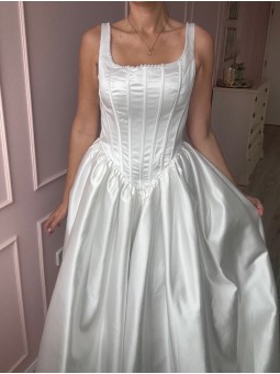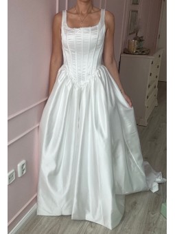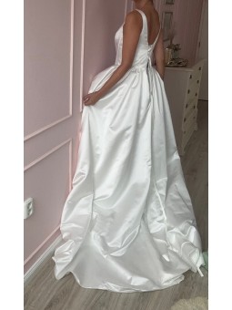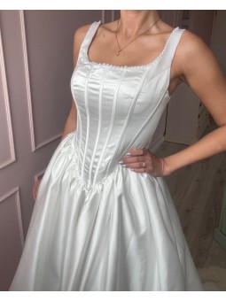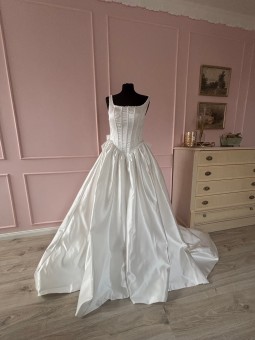 Bohatá objemná sukně se splývavou vlečkou dodává šatům královský charakter a vytváří působivý efekt při chůzi i na fotografiích. Zapínání na šněrovačku poskytuje dokonalé přizpůsobení postavě a zajišťuje pohodlí po celý den.