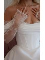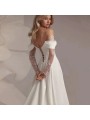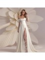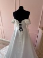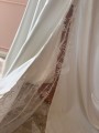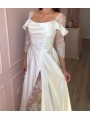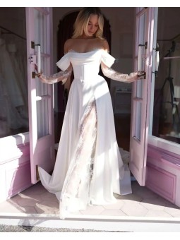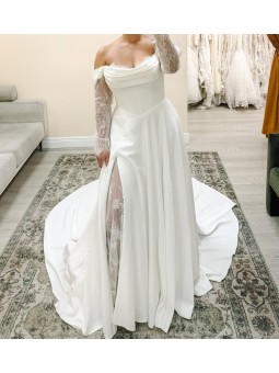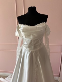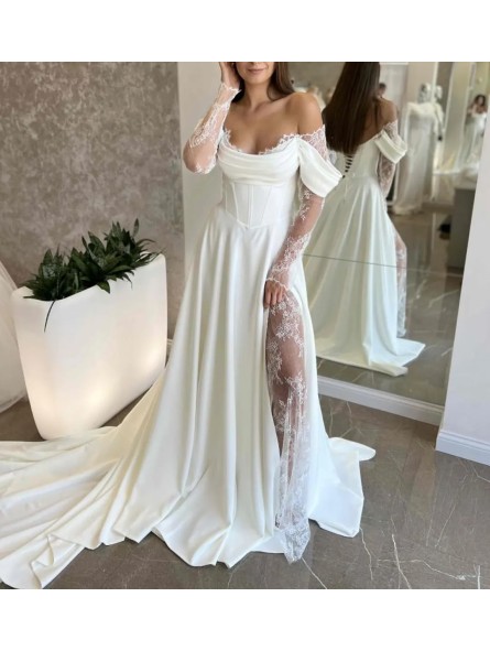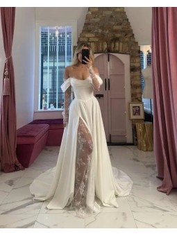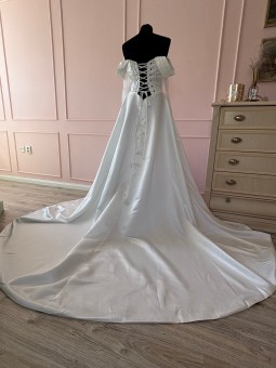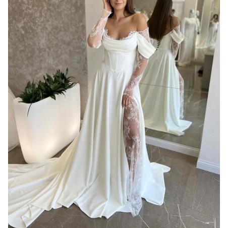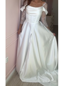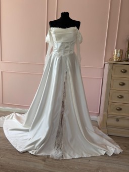 Svatební saténové šaty se sexy rozparkem, kde je vložená krajka. Korzetový top na šněrovačku, kde je také vložená rafinovaně krajka. Šaty mají spadlé ramena s krajkovými rukávy.