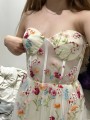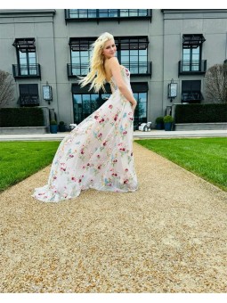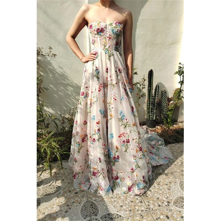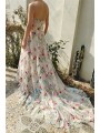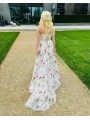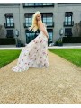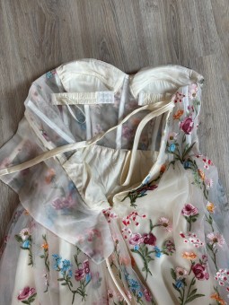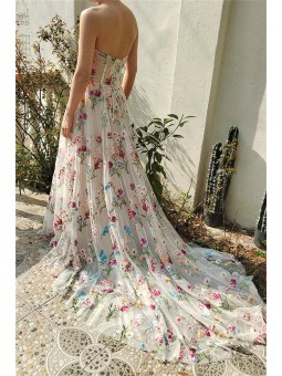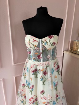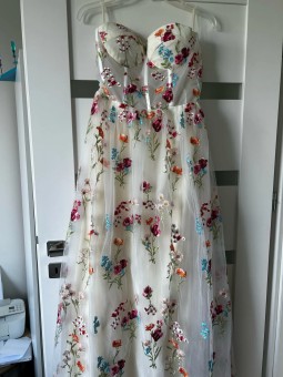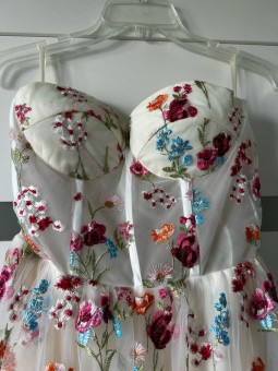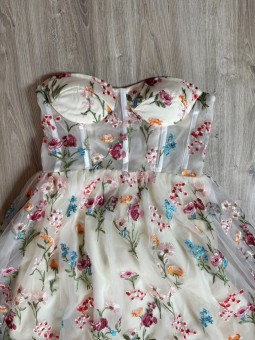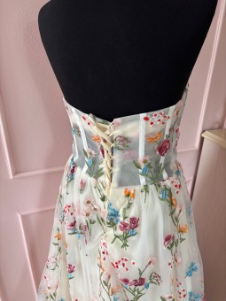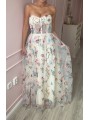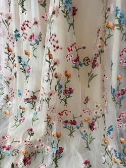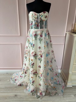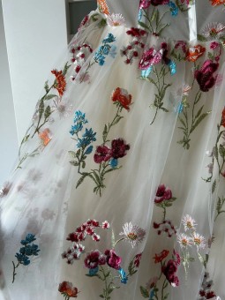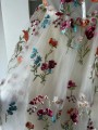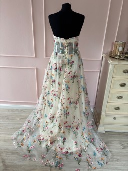 Svatební tylové květinové šaty na šněrovačku. Tento střih šatů je vhodnější pro štíhlejší postavy a menší prsa. Střih lze poupravit při šití na míru.