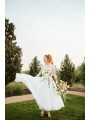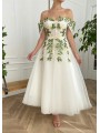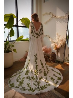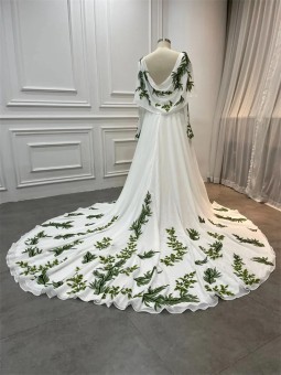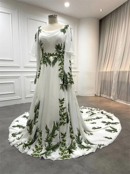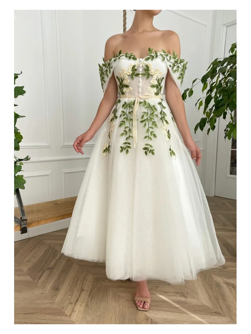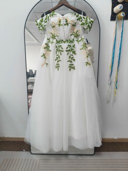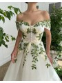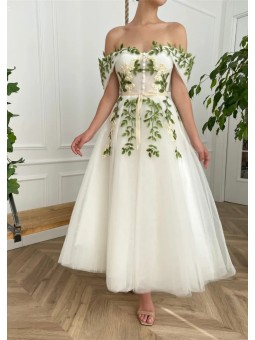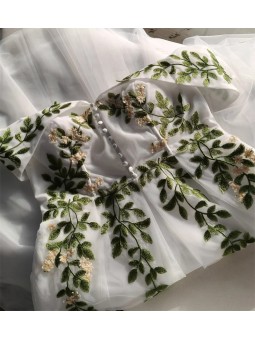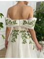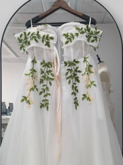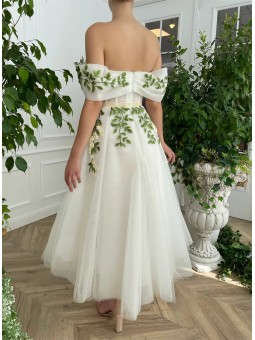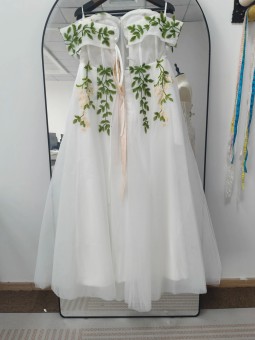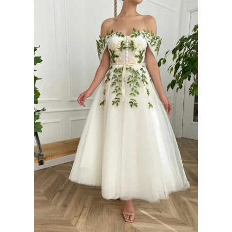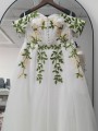 Květinové tylové svatební šaty se spadlými rukávky. Šaty mají knoflíky vpředu. Délka šatů je cca nad kotníky - dle Vaši výšky. Konfekční velikosti mají záda na šněrovačku, při šití na míru lze ušít na zip. Při šití na míru lze model poupravit včetně délky šatů.