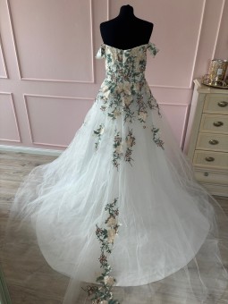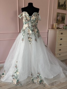 Květinové tylové svatební šaty se spadlými dlouhými rukávy. Na šněrovačku. Při šití na míru lze model poupravit a ušít v jiné barvě, pro změny nás nejdříve kontaktujte.