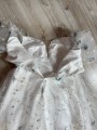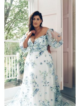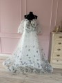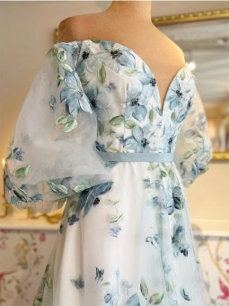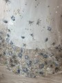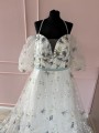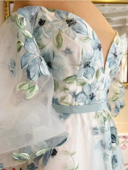 Živůtek je tvarovaný do srdcového výstřihu s jemnými ramínky a průsvitnými nabíranými rukávy z tylu, které působí étericky a romanticky. Celé šaty jsou pokryté bohatou výšivkou květin v odstínech modré, zelinkavé a zlaté která vytváří dojem živé louky. Sukně z několika vrstev tylu.