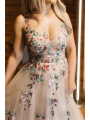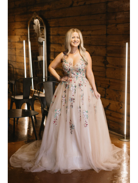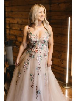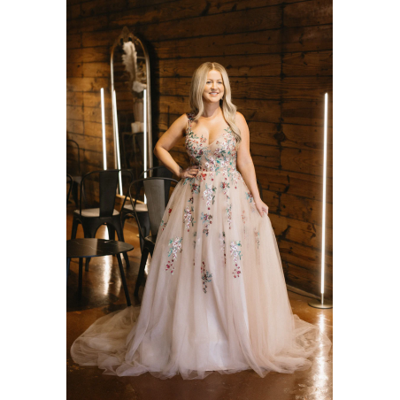 Tyto nádherné svatební šaty vynikají jemným romantickým vzhledem a dokonale zvýrazní ženskou siluetu. Průsvitný živůtek s barevnou květinovou výšivkou působí něžně a zároveň elegantně. Bohatá tylová sukně s vlečkou dodává šatům pohádkový vzhled, zatímco šněrovačka na zádech umožňuje perfektní přizpůsobení postavě.