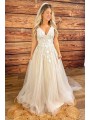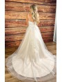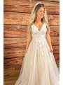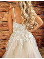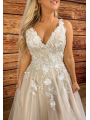 Okouzlující svatební šaty v jemném šampaň odstínu a nádhernou krajkovou aplikací po živůtku a horní části sukně. Hluboký výstřih do V vpředu působí smyslně, zatímco bohatá tylová sukně dodává šatům pohádkový vzhled.