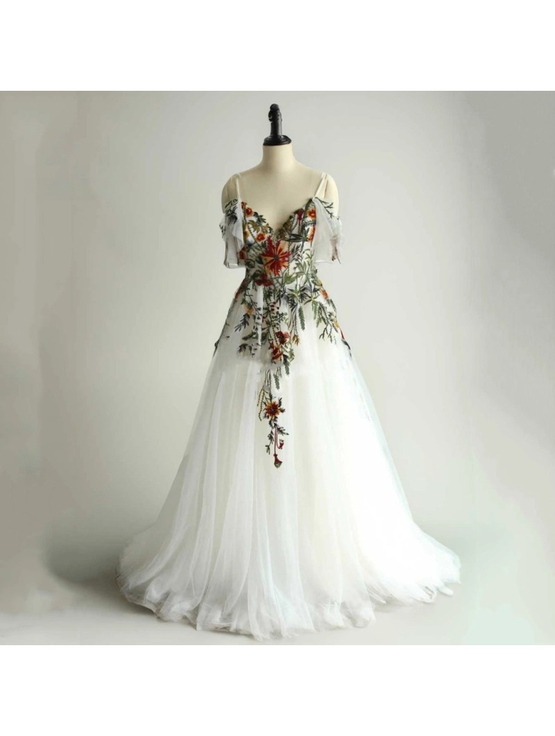 Vstupte do svého velkého dne jako z pohádky s těmito nádhernými šaty „Giselle“. Tyto éterické svatební šaty kombinují jemnost bílého tylu s bohatou, vyšívanou květinovou aplikací, která dodává šatům romantický, boho-náladou inspirovaný vzhled.