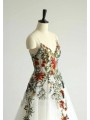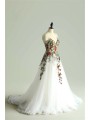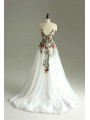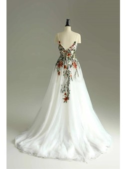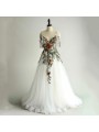 Zadní část: Elegantní hluboký výstřih do V, který přechází do bohaté tylové sukně s květinovým dekorem v dolní části.