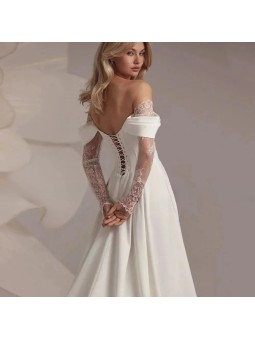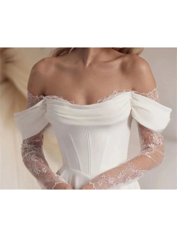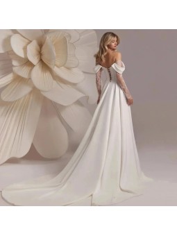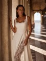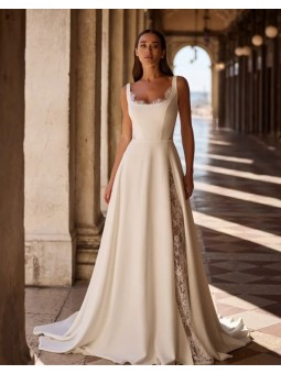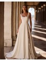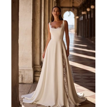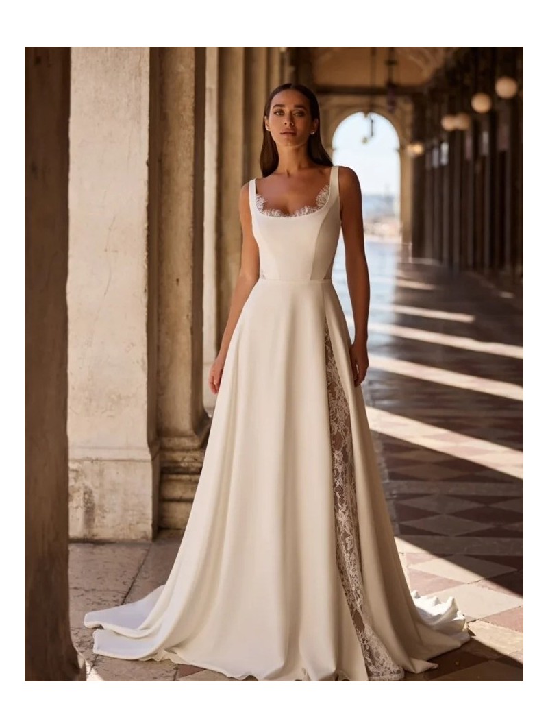 Hladký, splývavý materiál působí luxusně a zároveň se krásně hýbe při každém kroku. Romantický živůtek s jemným krajkovým lemem dodává šatům něžný nádech, zatímco rafinovaný rozparek odhalující krajku vytváří efektní, smyslný detail — ideální pro nevěsty, které hledají originalitu, ale chtějí zůstat elegantní.