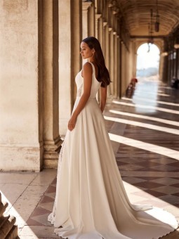 Vstupte do svého velkého dne v šatech, které spojují nadčasovou eleganci a moderní ženskost. Tyto svatební šaty s čistou siluetou okouzlí na první pohled díky dokonale propracovanému střihu, který přirozeně zvýrazňuje pas a prodlužuje postavu.