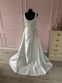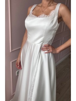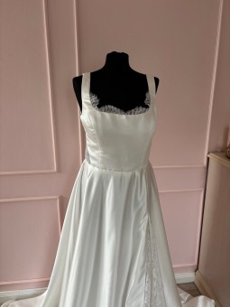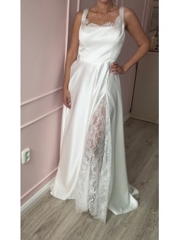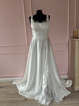 Hladký, splývavý materiál působí luxusně a zároveň se krásně hýbe při každém kroku. Romantický živůtek s jemným krajkovým lemem dodává šatům něžný nádech, zatímco rafinovaný rozparek odhalující krajku vytváří efektní, smyslný detail — ideální pro nevěsty, které hledají originalitu, ale chtějí zůstat elegantní.