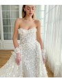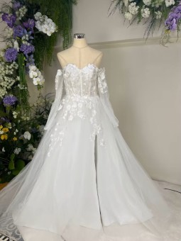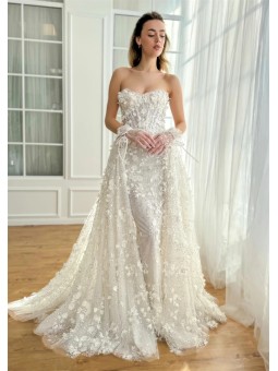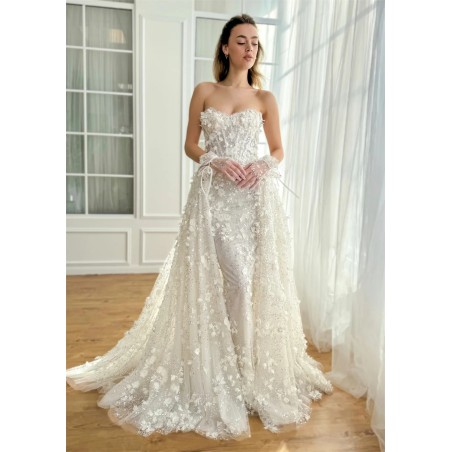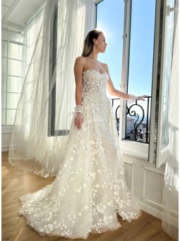 Šaty mají srdíčkový korzetový živůtek bez ramínek, který krásně zvýrazní dekolt a siluetu. Celé šaty jsou zdobené jemnou 3D krajkou s květinovými aplikacemi.